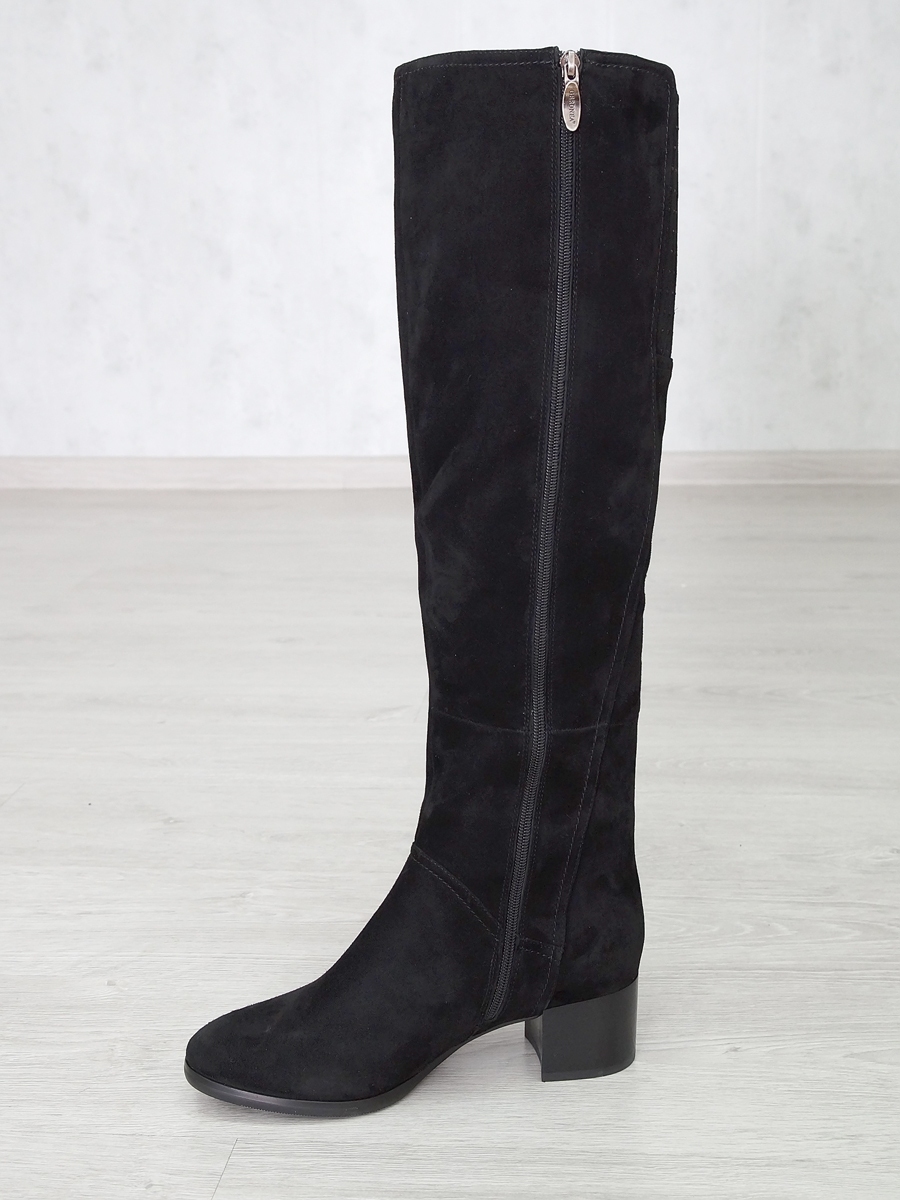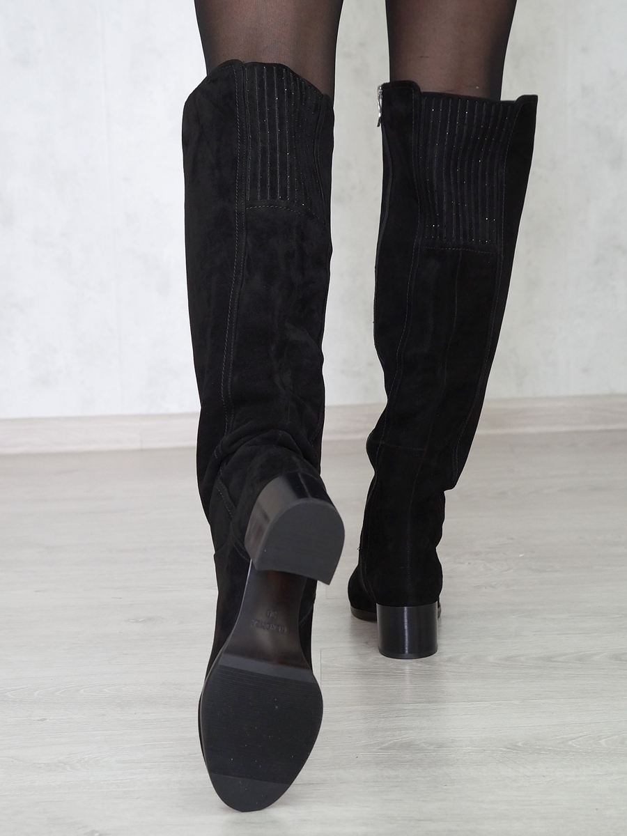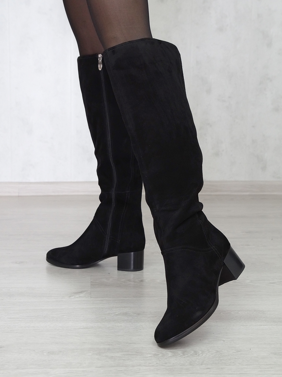 Ботфорты женские зимние черные на каблуке с верхом из натуральной замши. Подклад выполнен из евромеха (натуральный мех до уровня щиколотки) и натуральной байки, расположенной по всему голенищу, что доставит Вашей ноге приятные мягкие ощущения во время носки. Натуральный мех надежно удерживает тепло внутри, впитывая естественную влагу стопы. Высокое качество материалов - то, что выделяет эти зимние женские сапоги. Натуральная замша не только способствуют комфорту в эксплуатации, но и не требуют трудоемкого ухода, надолго сохраняя первоначальный внешний вид. Подошва имеет хорошую теплостойкость, это позволит сохранить тепло даже в самую холодную погоду. С внутренней стороны обуви находится молния, что позволит Вам легко надевать и снимать сапоги. Лаконичные по дизайну, черные - подойдут для походов в офис, школу, для прогулок по городу. Модель удачно дополнит зимний образ с пуховиком, пальто или короткой курткой. БОТФОРТЫ С УВЕЛИЧЕННОЙ ПОЛНОТОЙ (8)