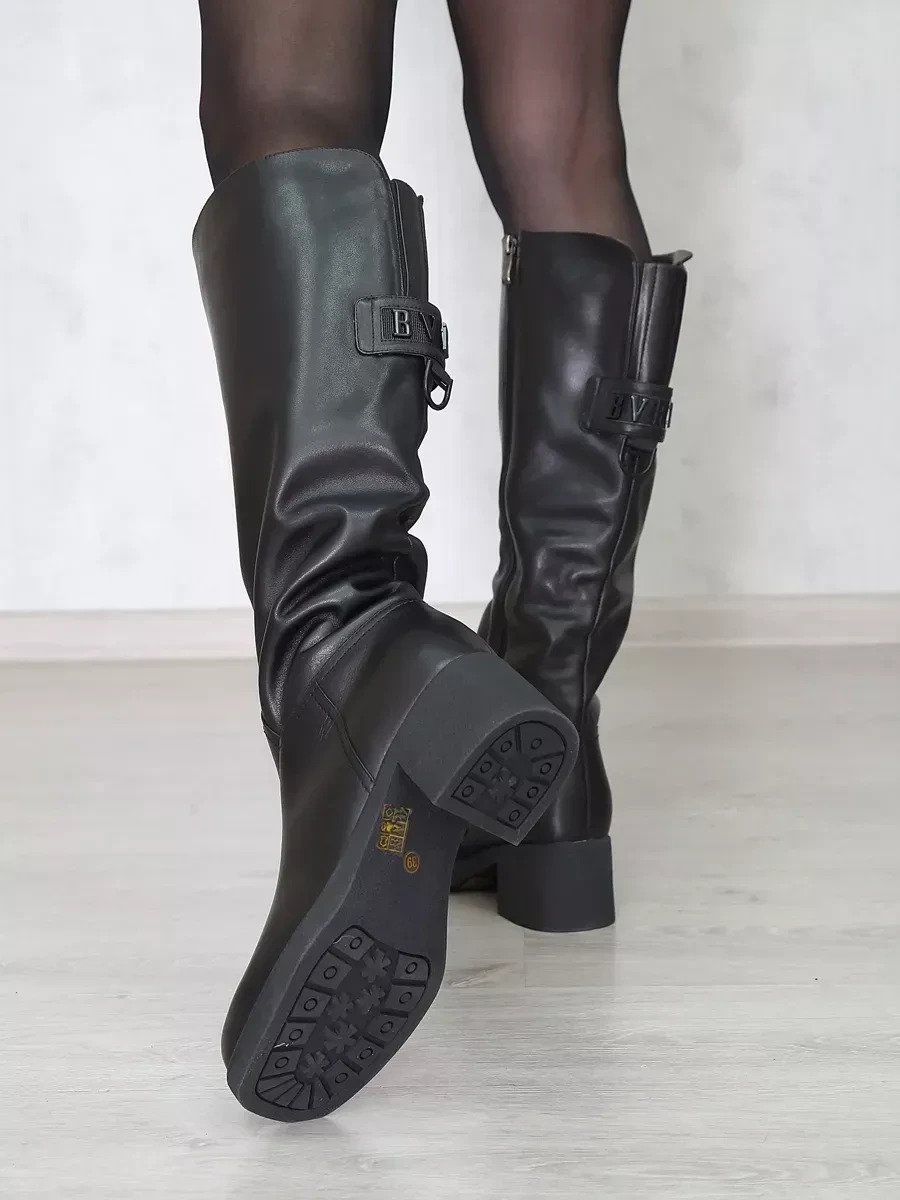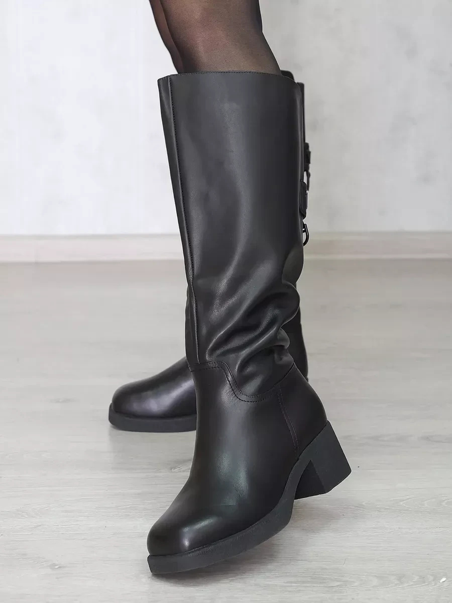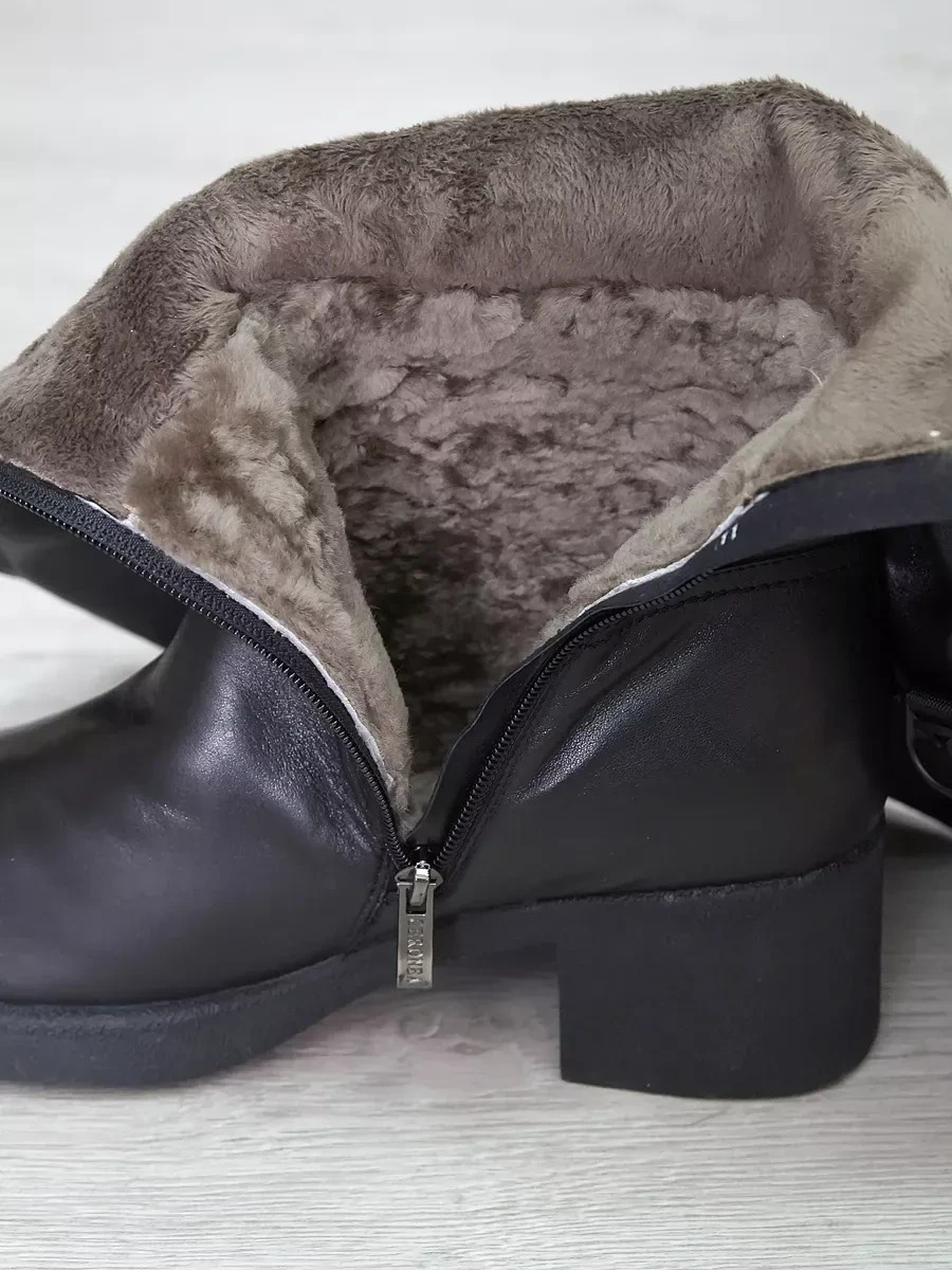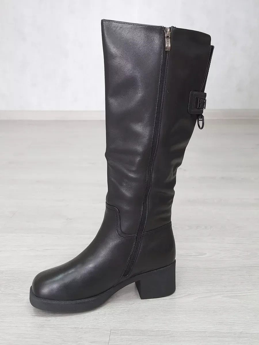 Сапоги женские зимние черные на каблуке с верхом из натуральной кожи. Подклад выполнен из евромеха (натуральный мех до уровня щиколотки) и натуральной байки, расположенной по всему голенищу, что доставит Вашей ноге приятные мягкие ощущения во время носки. Натуральный мех надежно удерживает тепло внутри, впитывая естественную влагу стопы. Высокое качество материалов - то, что выделяет эти зимние женские сапоги. Натуральная кожа не только способствуют комфорту в эксплуатации, но и не требует трудоемкого ухода, надолго сохраняя первоначальный внешний вид. Подошва имеет хорошую теплостойкость, это позволит сохранить тепло даже в самую холодную погоду. С внутренней стороны обуви находится молния, что позволит Вам легко надевать и снимать сапоги. Лаконичные по дизайну, черные - подойдут для походов в офис, школу, для прогулок по городу. Модель удачно дополнит зимний образ с пуховиком, пальто или короткой курткой.