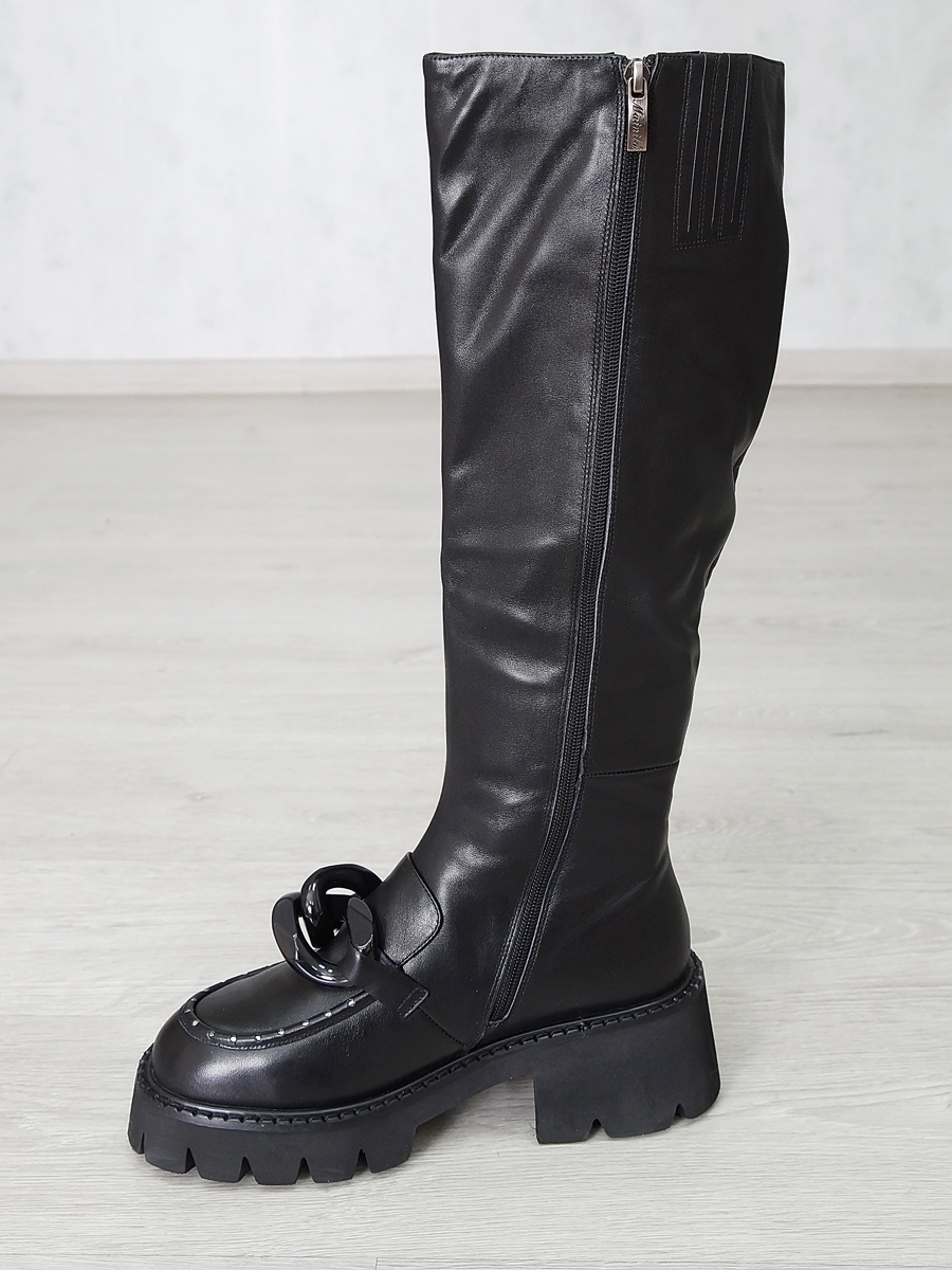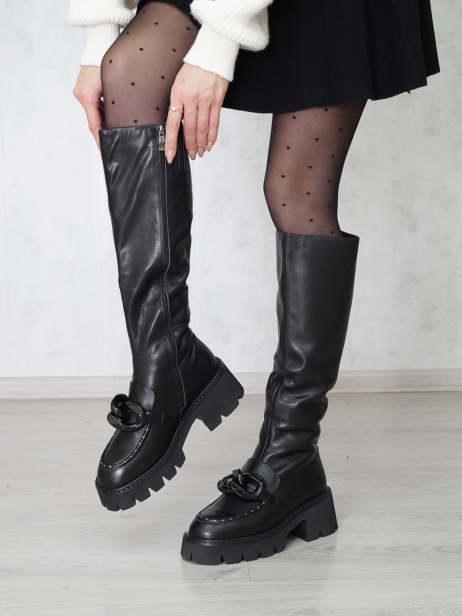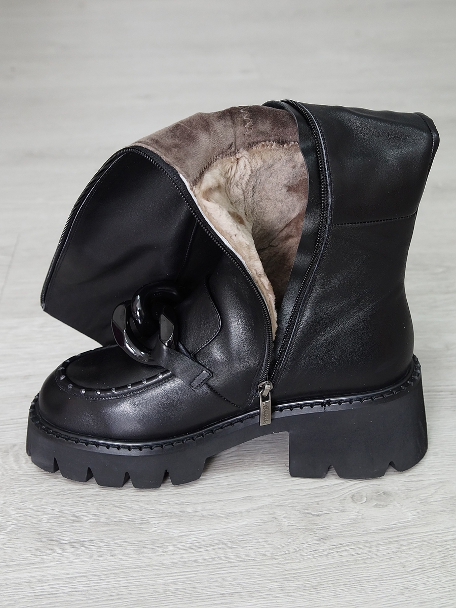 Сапоги женские зимние черные на каблуке с верхом из натуральной кожи. Подклад выполнен из евромеха (натуральный мех до уровня щиколотки) и натуральной байки, расположенной по всему голенищу, что доставит Вашей ноге приятные мягкие ощущения во время носки. Натуральный мех надежно удерживает тепло внутри, впитывая естественную влагу стопы. Высокое качество материалов - то, что выделяет эти зимние женские сапоги. Натуральная кожа не только способствуют комфорту в эксплуатации, но и не требует трудоемкого ухода, надолго сохраняя первоначальный внешний вид. Подошва имеет хорошую теплостойкость, это позволит сохранить тепло даже в самую холодную погоду. С внутренней стороны обуви находится молния, что позволит Вам легко надевать и снимать сапоги. Лаконичные по дизайну, черные - подойдут для походов в офис, школу, для прогулок по городу. Модель удачно дополнит зимний образ с пуховиком, пальто или короткой курткой. Цепь и стразы в виде удачно дополняют модель.